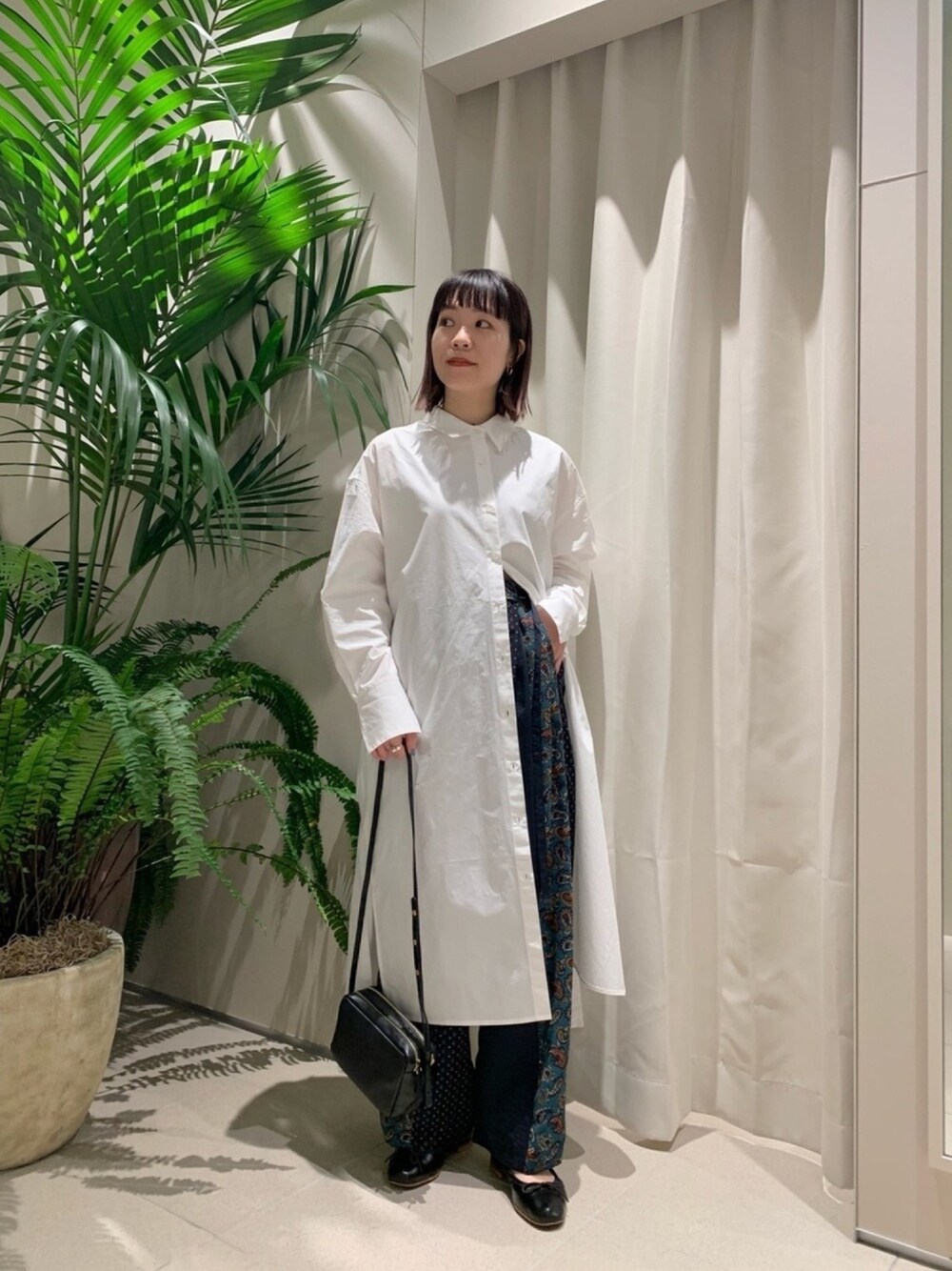 真っ白なシャツワンピは柄の可愛いパンツとレイヤード。 どちらもゆったりなシルエットなので、ワンピのボタンは下だけしっかり開けて抜け感を。 着用アイテム *バックギャザーシャツワンピース ・サイズ感: 全体的にゆったりしたサイズ感。着丈は長すぎず、小柄さんでも着やすい。 ・着心地: ハリのあるしっかりしたコットン素材で着心地よし。 *異素材パンツ ・サイズ感: ウエストのベルトでサイズの調整が可能ですが、比較的大きめのサイズ感。 シルエットもゆったり。 ・着心地: 軽く楽な履き心地。シワも気にならないのが嬉しいポイント。 *【MANSUR GAVRIEL】DOUBLE ZIP CROSSBODY カジュアルにも綺麗めにも使えるシンプルなデザインのレザーバッグは牛革で柔らかく使いやすい。小振りで細めのストラップが上品な印象。