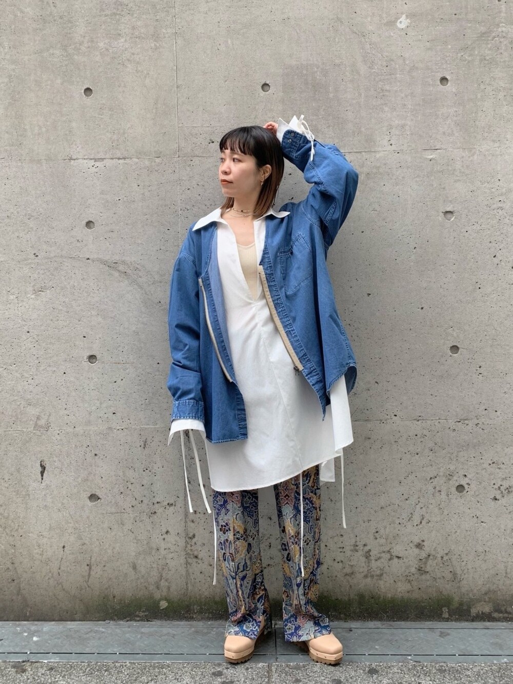 シンプルだけどルーズでデザイン性のあるmillのシャツに、配色と柄の可愛いパンツが映えます◎ 全体的にゆるゆる〜っとラフなスタイリング。 着用アイテム *ジャガード柄センタープレスパンツ ・サイズ感: 丈は長めなのでウエストで1回折ってます。シルエットは程よいゆとりで太すぎないのが良い。 ・着心地: サラッと軽く、シワにもなりにくい素材が嬉しい。 *シャツ、デニムシャツ【mill】