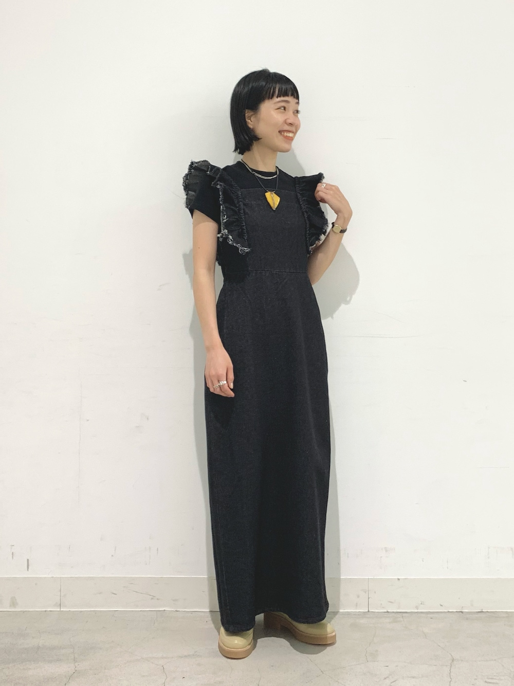 つなしまあゆみのワンピース「フリルデニムワンピース」を使ったコーディネート