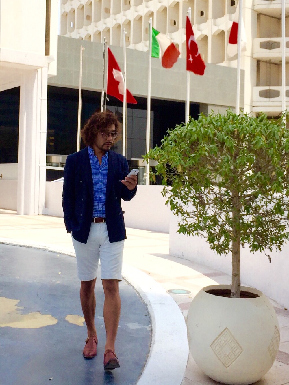 日本領事館に行ってきたよー‹‹\(´ω` )/›› 日の丸見ると落ち着く🎌 ダブルジャケットに短パン合わせてインにギンガムチェックシャツもってきたよ( ❝̆ ·̫̮ ❝̆ )✧ いちおうこんな格好だけど朝から仕事してるー ぺろーん