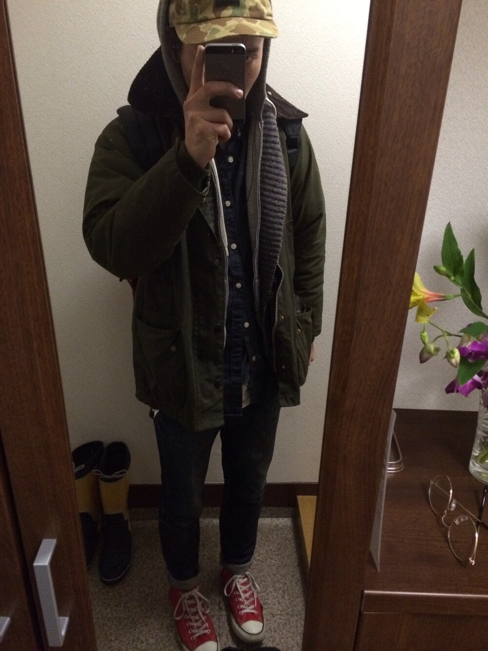 Outer : Barbour Knit : Used Hood : Used Shirts : H&M PNT : Hysteric Glamour Shoe : Converse Bag : EASTPACK Cap : FTC とにかく目がコワい…。 今日はこれにバカ眼鏡を着用。 リュックはこれまたバカっぽい柄で。