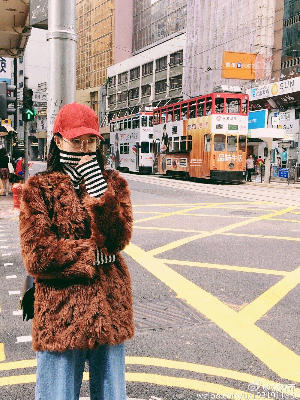 毛毛外套➕高领薄条纹毛衣➕牛仔宽松裤➕鸭舌帽。 A thin jacket, striped sweaters, denim pants, peaked cap.