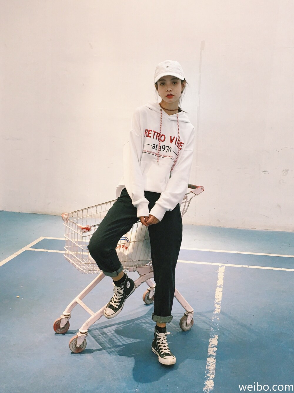鸭舌帽➕卫衣➕宽松牛仔裤➕匡威高邦运动鞋,休闲运动风,非常适合女生,显得年轻活力。 Peaked cap, sweater, baggy jeans, CONVERSE Kobron sports shoes, leisure sports fan, very suitable for girls, is the vitality of the young.
