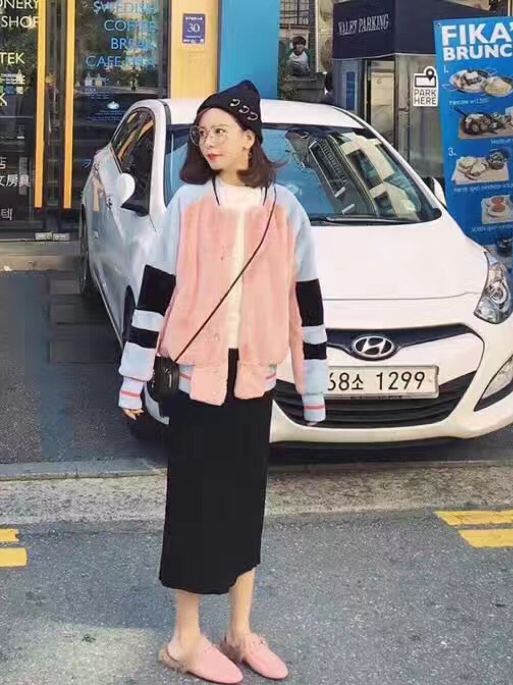 日韩系比较日常的搭配,小个子女生也可以hold的住,大的羊羔棉外套搭配长的针织裙配单鞋非常好看的~