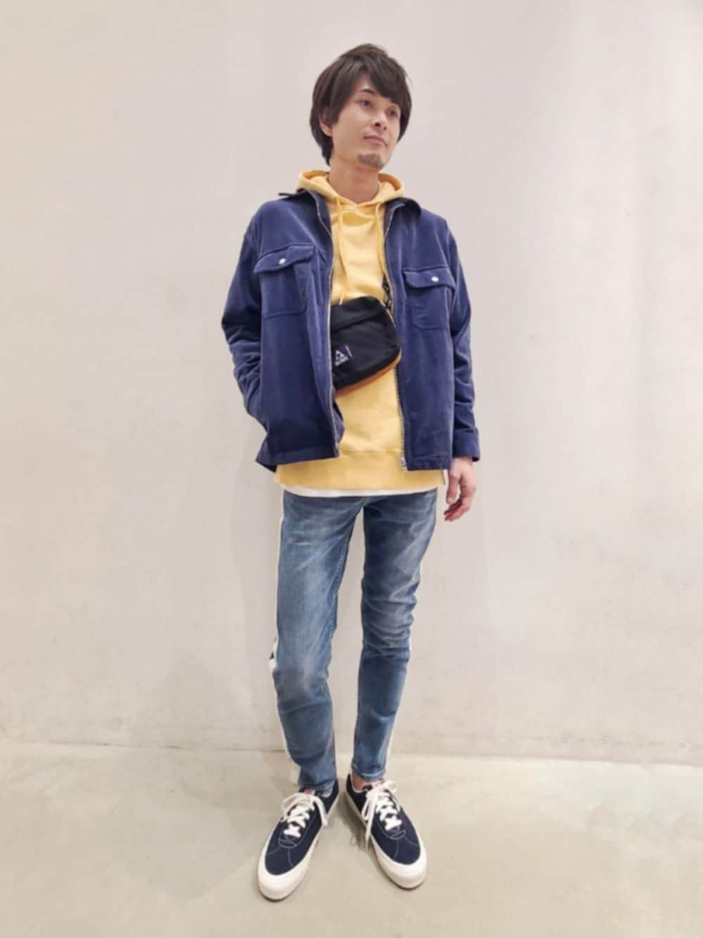 カラーアクセントにイエローのロゴパーカー 細畝のコーデュロイブルゾンとサイドラインパーカーで合わせました バンズのスニーカーは、ブルゾンとカラーリンクさせました