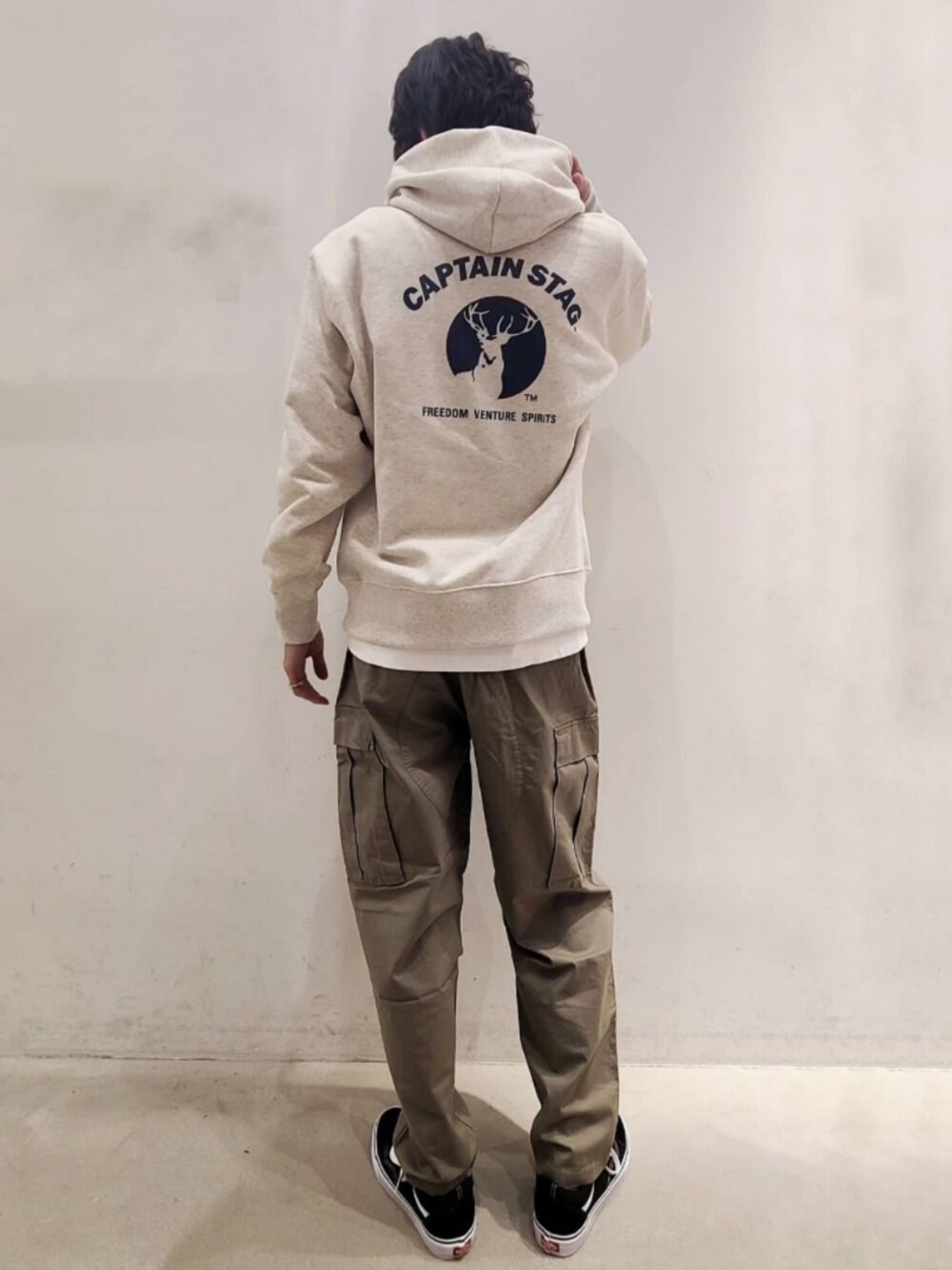 キャプテンスタッグのベイフロー別注パーカー ワイドシルエットのカーゴパンツでアウトドアテイストに バンズのスニーカーで合わせました
