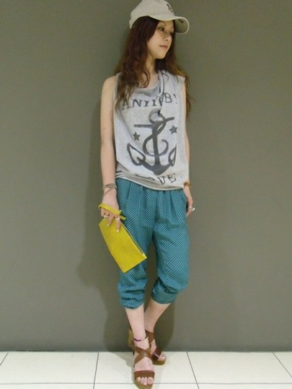 今シーズンおすすめインポートブランド【ANIYE BY】を使ったコーディネート。 アシンメトリーなデザインがポイントのカットソーは、肩まであげてタンクトップ風に。 ボトムスはくしゅっと上げて、コンパクトに仕上げました。 ゆったりめなデザインのアイテムはヒールのあるサンダルでまとめると、バランスよく仕上がります。