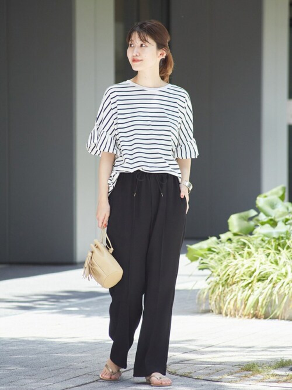 20代後半/身長163㎝ 普段着用サイズ/Mサイズ/ボトムス38 骨格:ウェーブ パーソナルカラー:ブルベ ---------------------------------------- ギャザースリーブポンチョTEE ポンチョ型Tシャツにフリルが付いたデザイン性のある一枚。 たっぷりと泳ぐようなゆとりのあるシルエットでボディラインを拾いません。 袖元のフリルがポイントになり、カットソーながらも上品な印象に◎ 少し前をINさせてスッキリとしたバランスを意識しました。 ---------------------------------------- 【サイズ感】 全体的にゆとりがあるため、体型を問わずご着用出来ます。 ボディラインを拾わず、腰回りもしっかり隠してくれます。 【素材感】 ゴワつきはなく、サラサラと心地の良い肌ざわり。 涼しく夏場に最適な素材感です。 【着用感】 カットソーでカジュアルながらもフリルの甘さを取り入れられる一枚。 ゆったりしており着心地も◎ 普段のTシャツから少し雰囲気を変えられるので、夏のワードローブに取り入れたいアイテムです! 【お洗濯】 ご自宅で洗濯可能