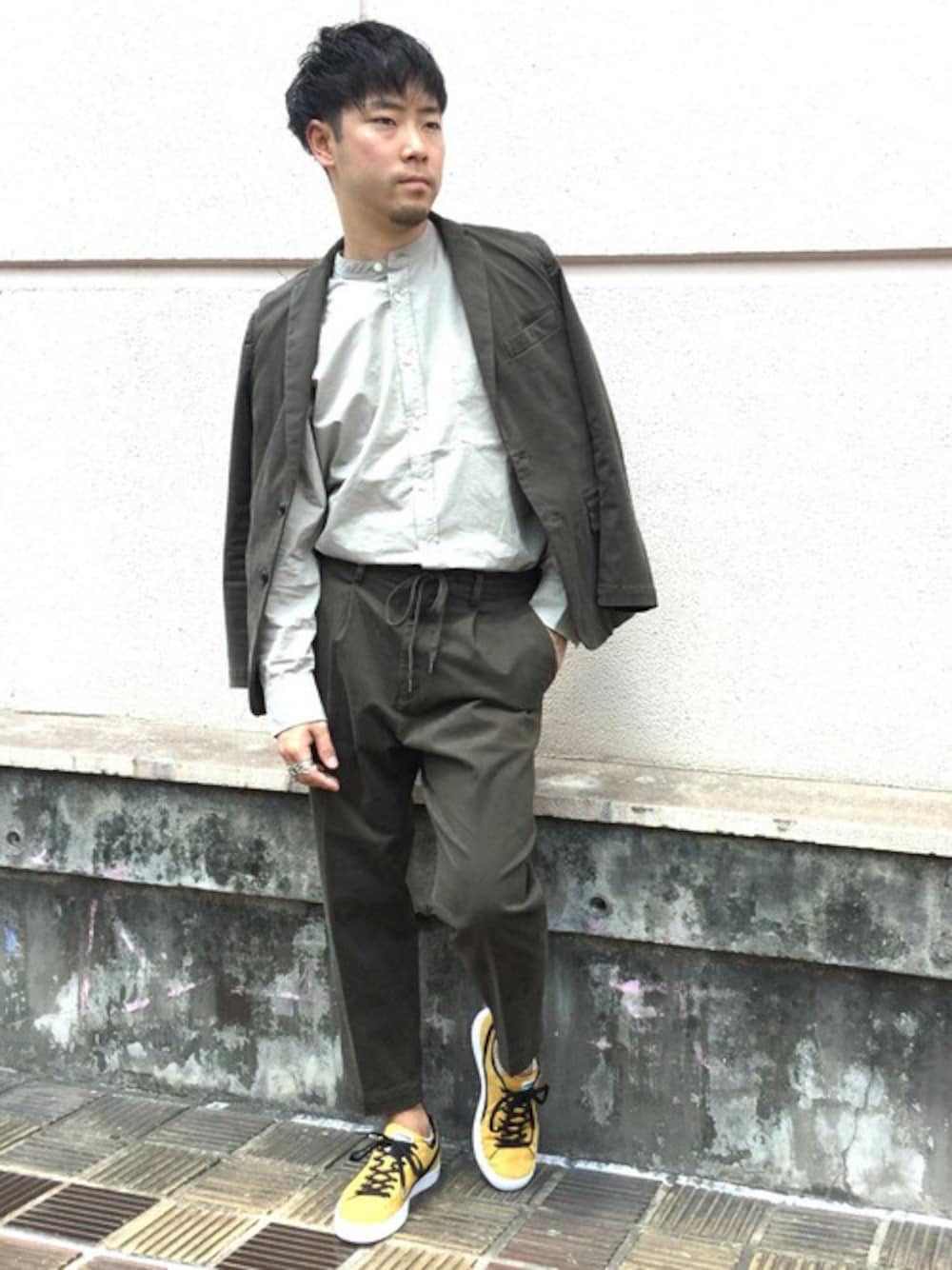 秋のセットアップスタイル サテン地のセットアップをバンドカラーシャツで合わせました。 イエローのスニーカーがアクセントになっています。