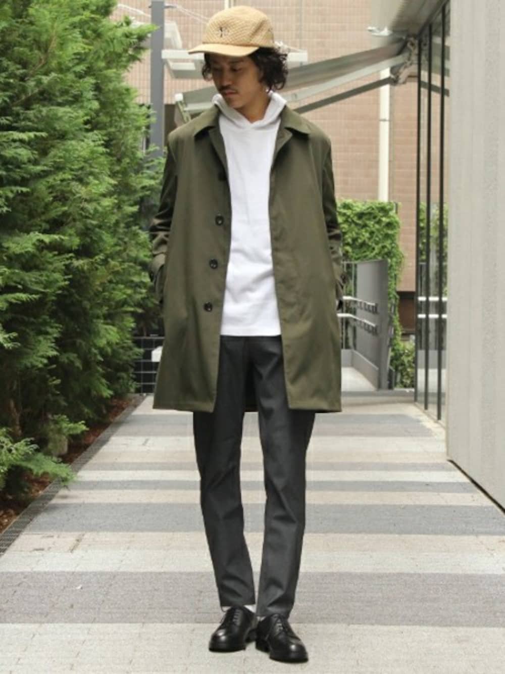 コートにパーカー合わせのストリートカジュアルスタイル。 ラフさとキレイ目をミックスしたスタイリング。