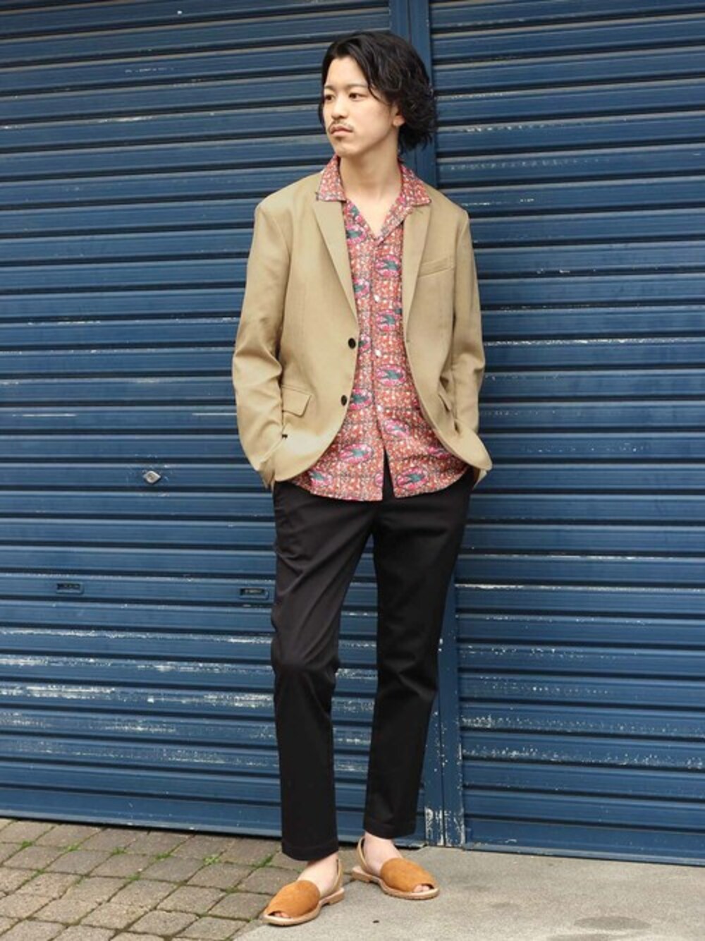 夏に向けて柄シャツ合わせのジャケットスタイル