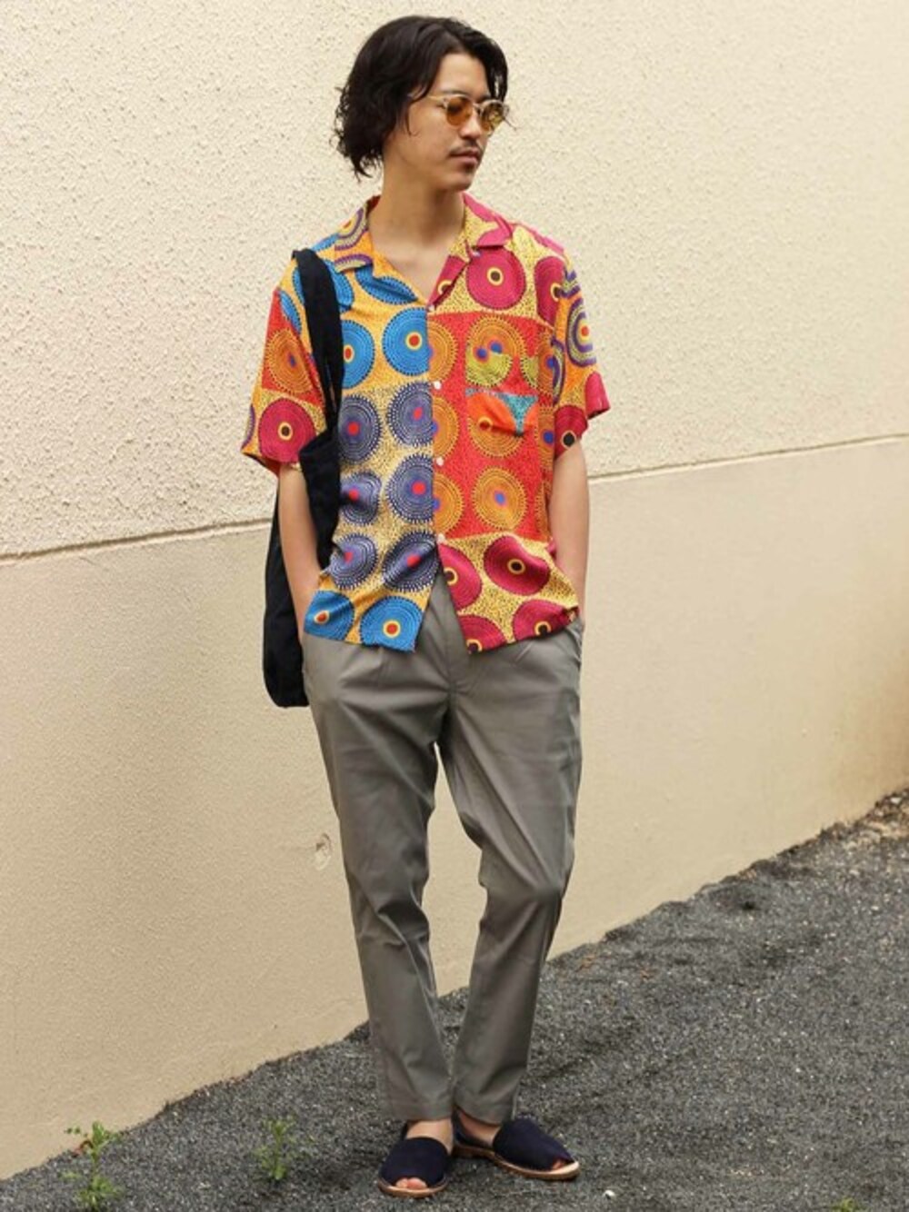 スッキリしながらも快適に履ける人気のLASKA素材のパンツで柄シャツあわせ