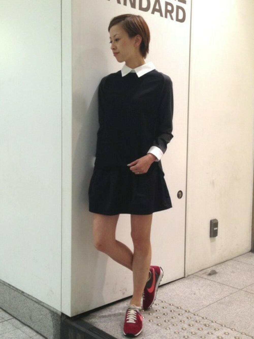 今季のキーアイテムであるスカートにシャツを合わせ女性らしく仕上げました。 足元をスニーカーではずすのがポイントです。