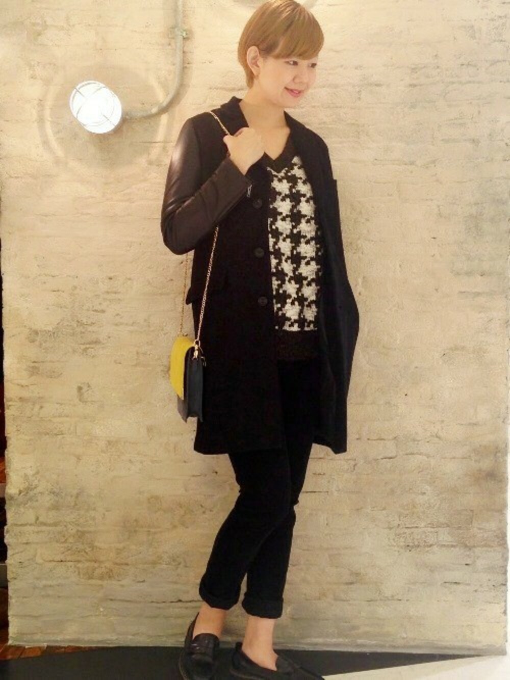今年トレンドのハンドトゥース柄をメインに黒でまとめたコーディネートに。 女性らしさを残しつつも、レザーをプラスすることで、甘さをおさえています。