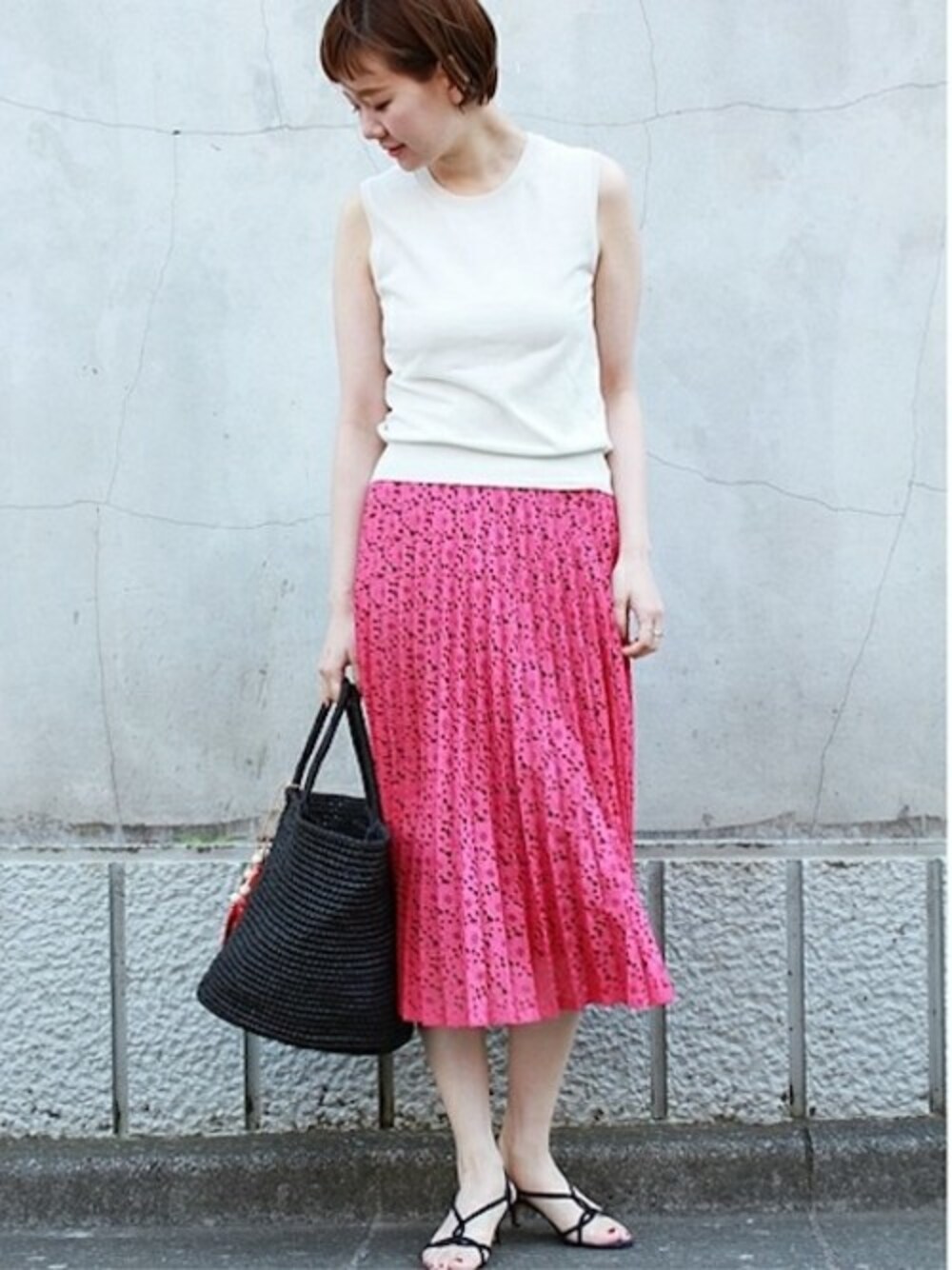 ◆大好評のレースのプリーツスカート 春夏テイストのカラーを取り込み、ラッセルレースと重ねることで遊びを持たせたデザインです! シックな印象になりがちなアイテムを、スニーカーやサンダルでカジュアルに合わせてカジュアルにも対応◎ 様々なテイストでお楽しみ頂けるスカートです。