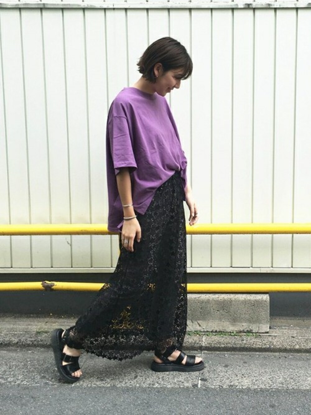 オーバーサイズのTシャツ×スカートのどこか抜け感のあるスタイリング。スカートの中にパンツをレイヤードすることで、こなれ感をプラス。 その日の気分によって様々な着こなしを楽しんで頂けますよ!!ゆったりしたトップスとも相性は抜群です。 前をインして着こなすのがポイント。