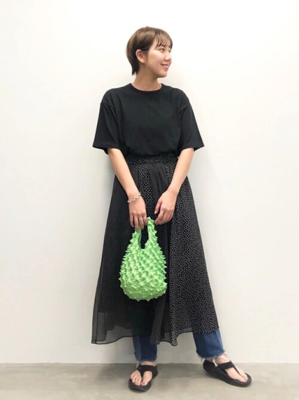 ドッキングドットスカート 透け感があり涼し気なドットスカート。デザイン性もありTシャツと合わせるだけで着映えする1着です。 サイズ感:ウエストゴムなので履きやすく、丈も長すぎず小柄な方も着ていただきやすいです。 素材感:ポリエステル100%で軽く、自宅ケアも可能です。 着心地:1枚で着ると裾が透けて可愛いですし、デニムやレギンスとのレイヤードスタイルもおススメです。