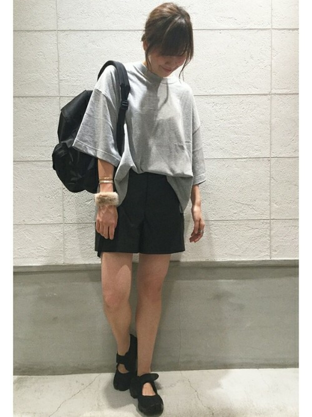 レザーのショートパンツにゆったりとしたトップスを合わし、抜け感のあるスタイリングしました。 ボーイッシュになりすぎないファーバングルもポイントです。