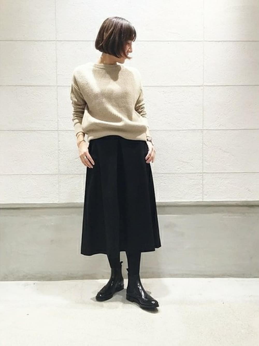 女性らしさのあるニットコーデ。 こちらは肩落ちのニットに、ミモレ丈のスカートを合わせ、女性らしいスタイリングにぴったりのコーディネートです。