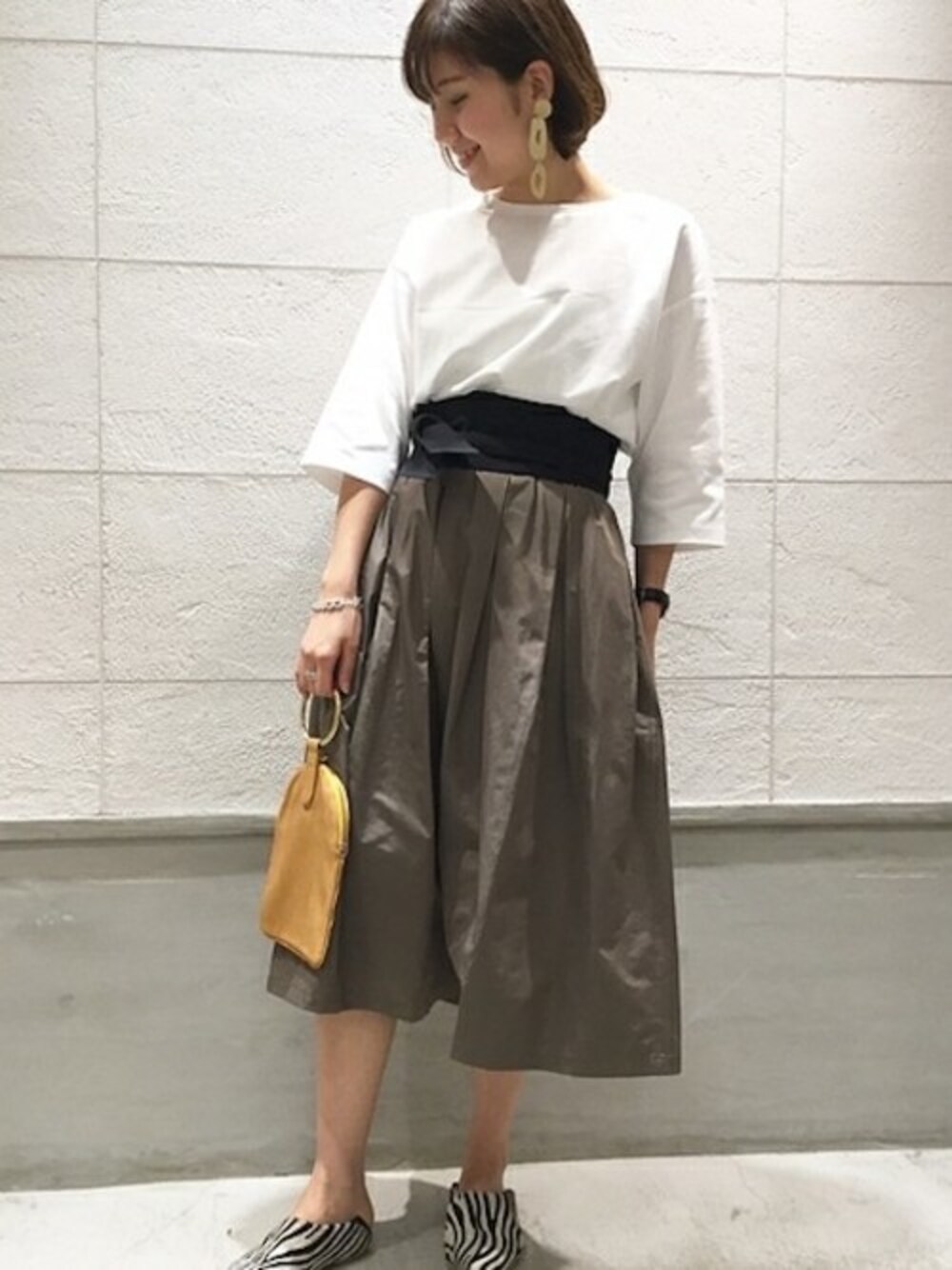 オススメ春コーディネート 張り感と光沢のあるスカートにトレンドのサッシュベルトで女性らしいコーディネートに。小物の色使いもポイントです。