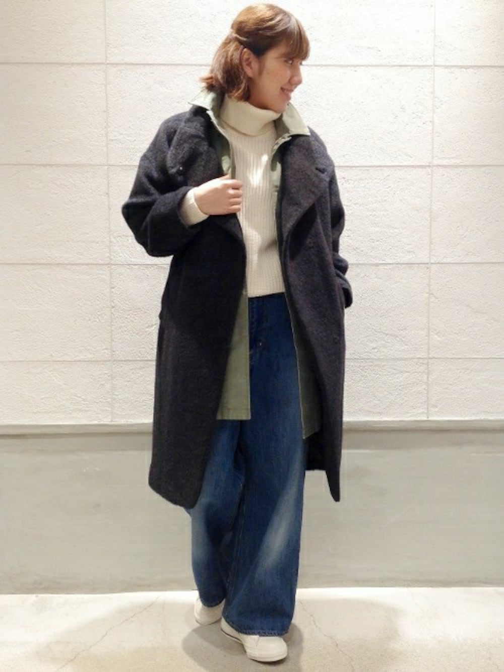 アウターとジャケットを重ねたレイヤードスタイルで、格好良くスタイリングしました。 中に着たタートルネックのニットは、バックスタイルまで可愛いですよ◎