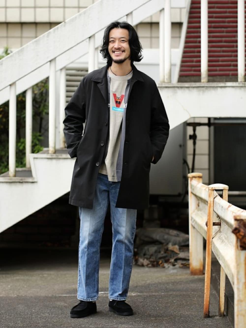 【LASKA】 270HT Air Coat / エアーコート 身長:178cm/体重:70kg/普段サイズ:L/着用サイズ:L 外回りの多い春男子こと玉木は、軽くて脱いでも移動の邪魔にならない高機能素材ファブリック「LASKA FABRIC」新作ステンカラーコートをチョイス。 サイズ感:ジャストサイズ 素材感:とても軽く、柔らかな肌触り 着心地:軽くてストレスが少ない