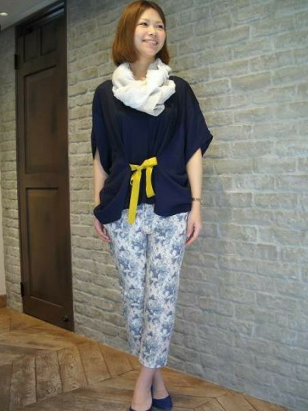SHOPでもお問い合わせの多い柄パンツを使ったコーディネート。 ぼかしたような淡いカラーのフラワープリントが優しい雰囲気のパンツには フロントリボンのプルオーバーにネイビーのパンプス・・・と同系色でまとめました。 イエローのリボンがアクセントになった、春らしいコーディネートの完成です♪ ストレッチの入ったパンツは動きやすさも◎ これからの季節、レジャーなどにもお勧めです!