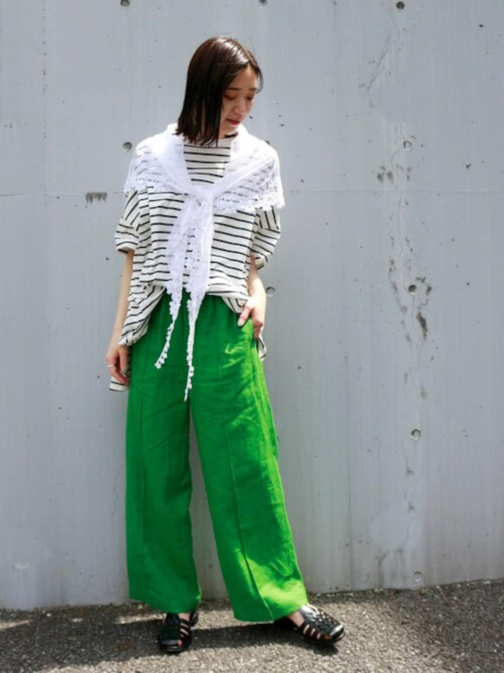 ワイドポンチョTee 今シーズントレンドのボーダーカットソーもポンチョシルエットが他にはないデザイン。 軽い素材感がこれからの時期に大活躍すること間違いなしなアイテムです。 ボトムスは鮮やかなカラーが目を引くリネンパンツ。 ウエストのデザインが可愛いのでトップスinもサマになります。 首元にレースストールを合わせてカジュアル過ぎずスタイリング。 サイズ感:他にはないポンチョシルエットが飽きが来ず着て頂けます。 素材感:さらっとした軽い素材感が魅力。 着心地:カジュアルなアイテムなのでレースストールやネックレスで女性らしさも忘れずに。