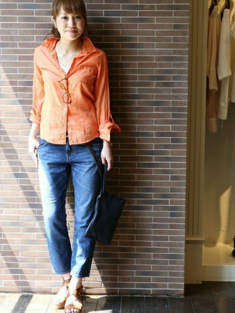 鮮やかなオレンジのシャツをメインに。かっちりとした印象のシャツブラウスも、しわ感のあるコットン素材ならカジュアルに仕上がります。コンパクトなシルエットや、デコルテラインが綺麗に見えるスキッパーの襟元が女性らしさもプラス。