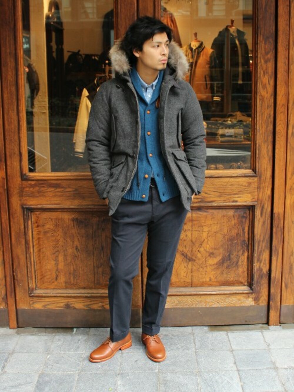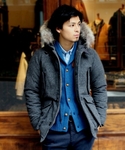今期イチオシのツイードダウンコートをメインにニット、パンツ、シャツをブルーグラデーションでまとめたスタイル。