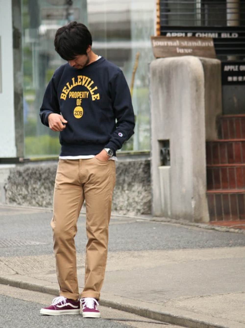 カレッジプリントのスウェットにチノパン、バンズで超定番アメカジスタイル。