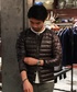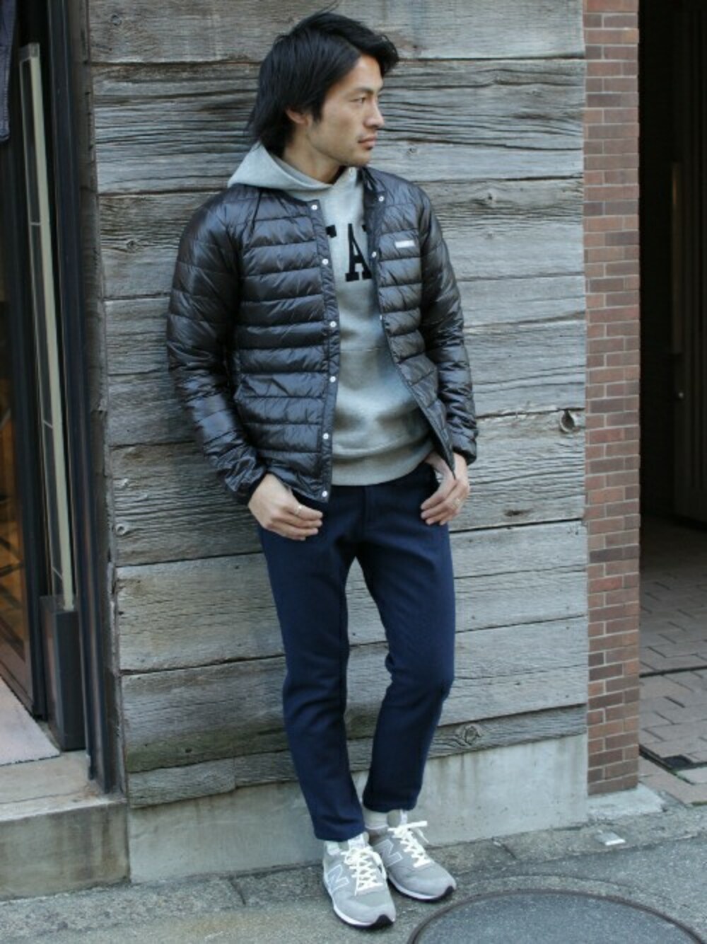 トレンドのインナーダウンジャケットスタイリング。SWEATパーカーにアンクル丈のフラノパンツで冬のスポーティーコーデの完成。