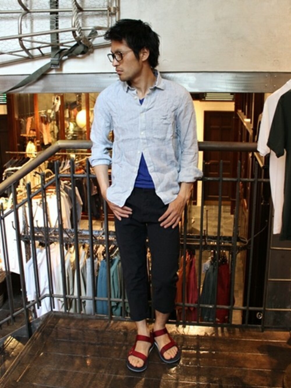 赤いストラップのサンダルが際立った、ブルーを基調としたスタイリング。大人サマールックの提案です。