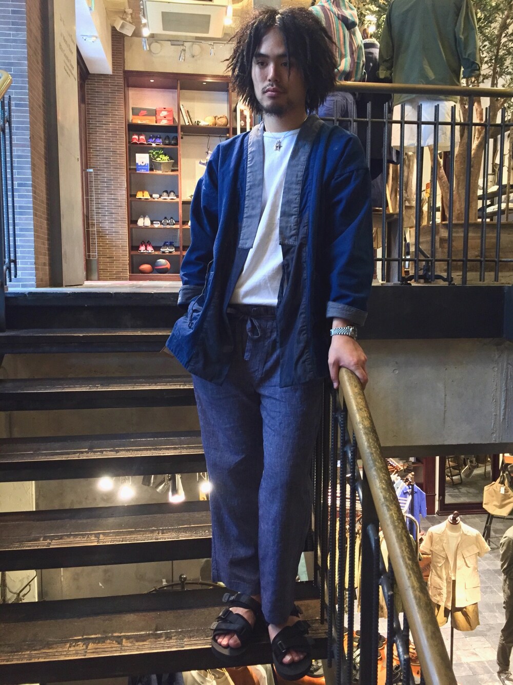 J.S HOMESTEDのフィルターを通した、インディゴスタイル。日本の伝統衣装である『作務衣(サムエ)』にイージーパンツを合わせ、白Tシャツをタックインさせた大人カジュアルなスタイル。