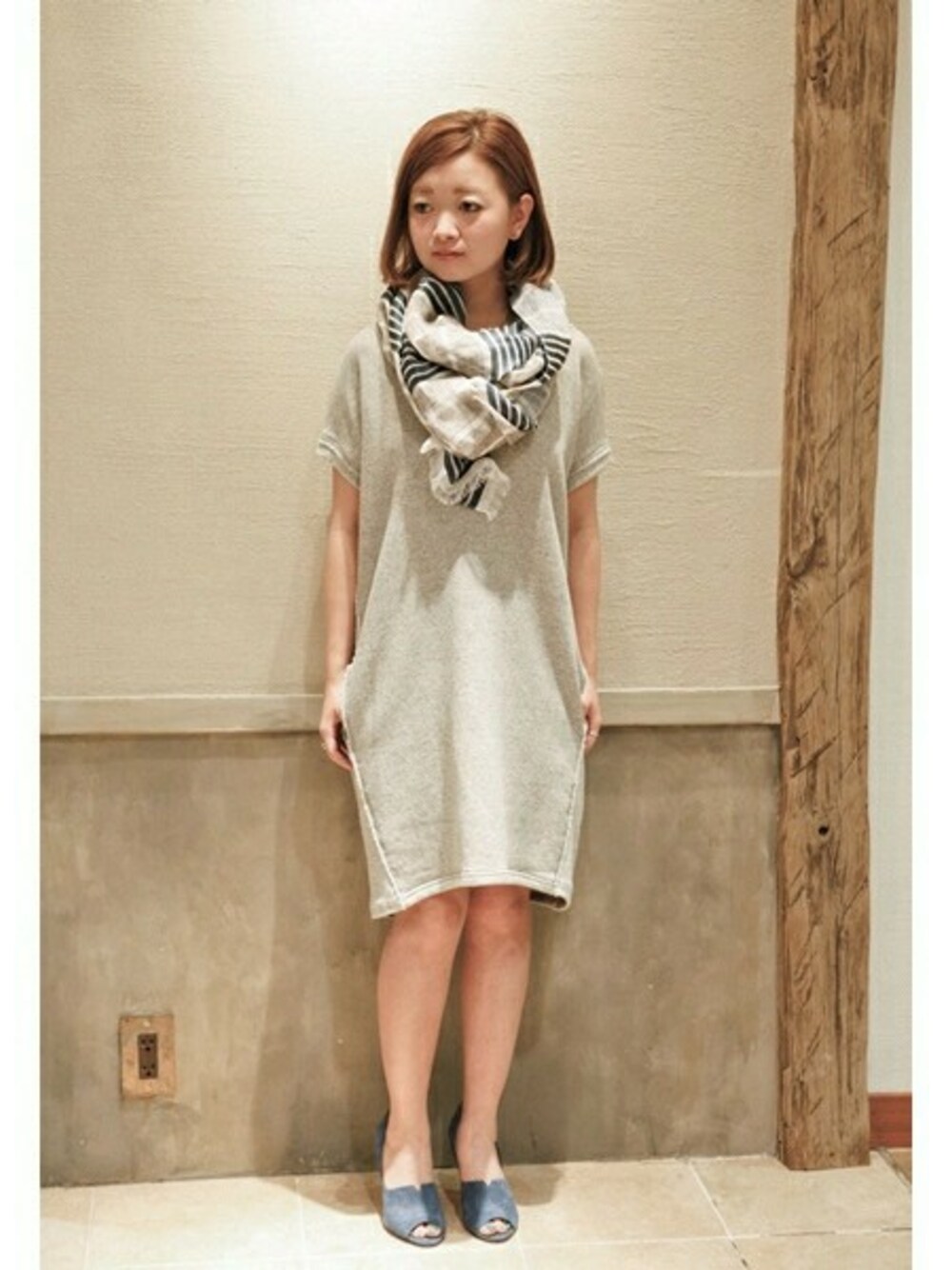 カジュアルな印象のスウェットワンピースもヒールを合わせれば女性らしく。 一見シンプルなデザインながら、バックのジップがアクセントに! 今年は足元やストールなどに、カラーアイテムを合わせるのがオススメ。