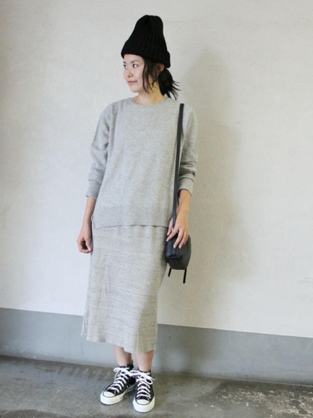 厚手のコットンを使用しているので、寒い時期のコーディネイトにもピッタリの一枚!全体をモノトーンでまとめて大人っぽくしています!