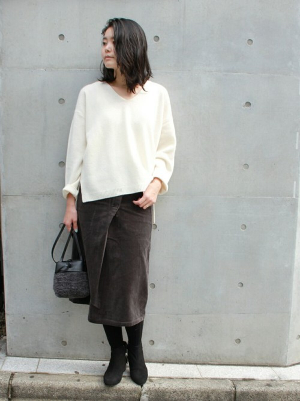 きれいなVネックのトップスに落ち着いたカラーのスカートを合わせて女性らしいスタイリングに。