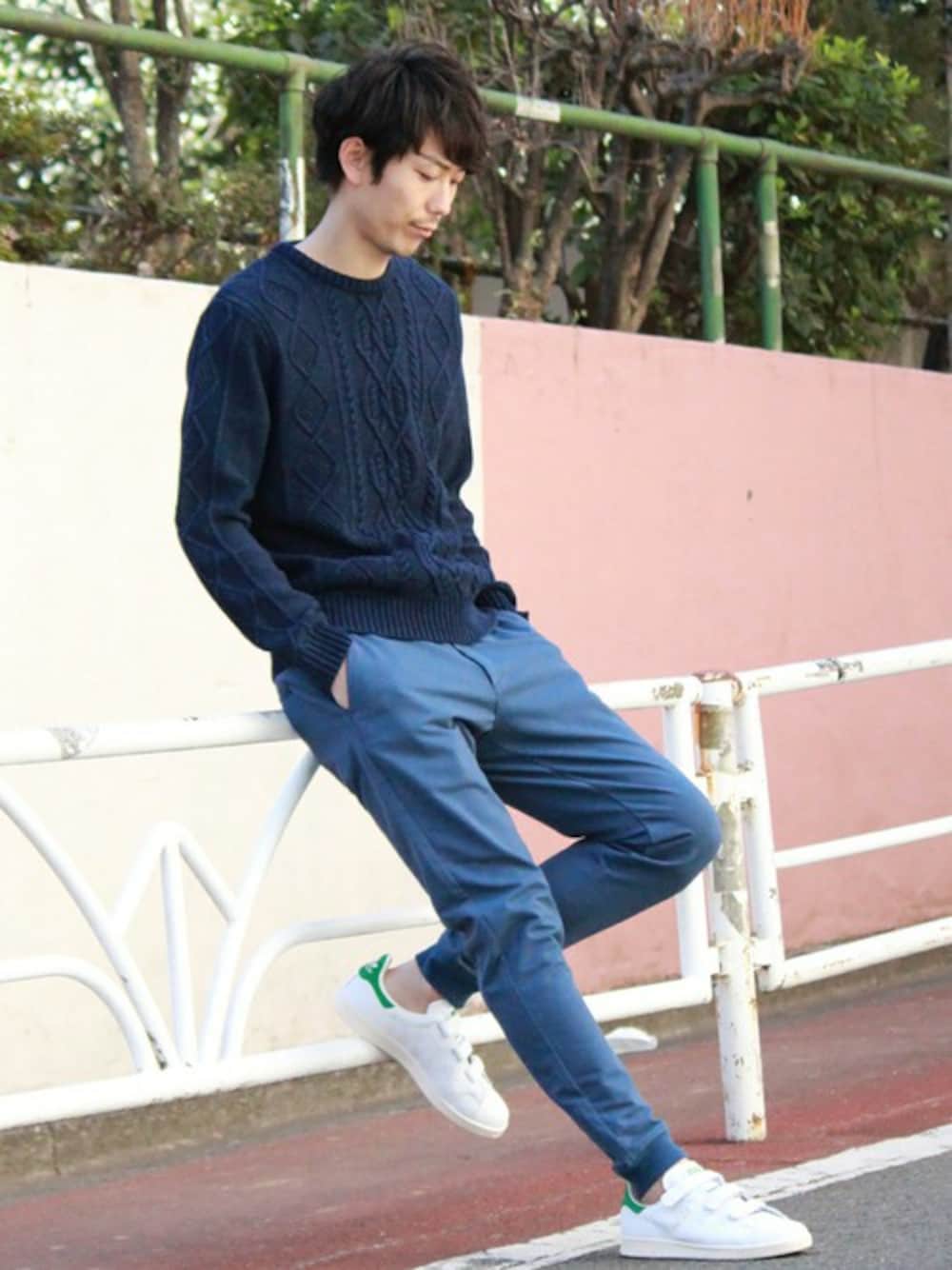 【2016SS】 春先に1枚で着るのにちょうどいいケーブル編みのニット。 裾リブパンツxスタンスミスで軽快なコーディネートです。