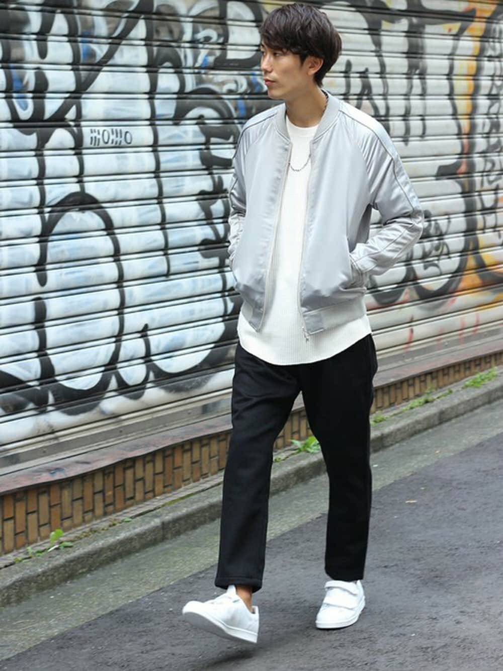 綺麗な着こなしで秋の演出 スカジャンの光沢感でカジュアルアイテムも綺麗な印象に出来る便利な羽織り。