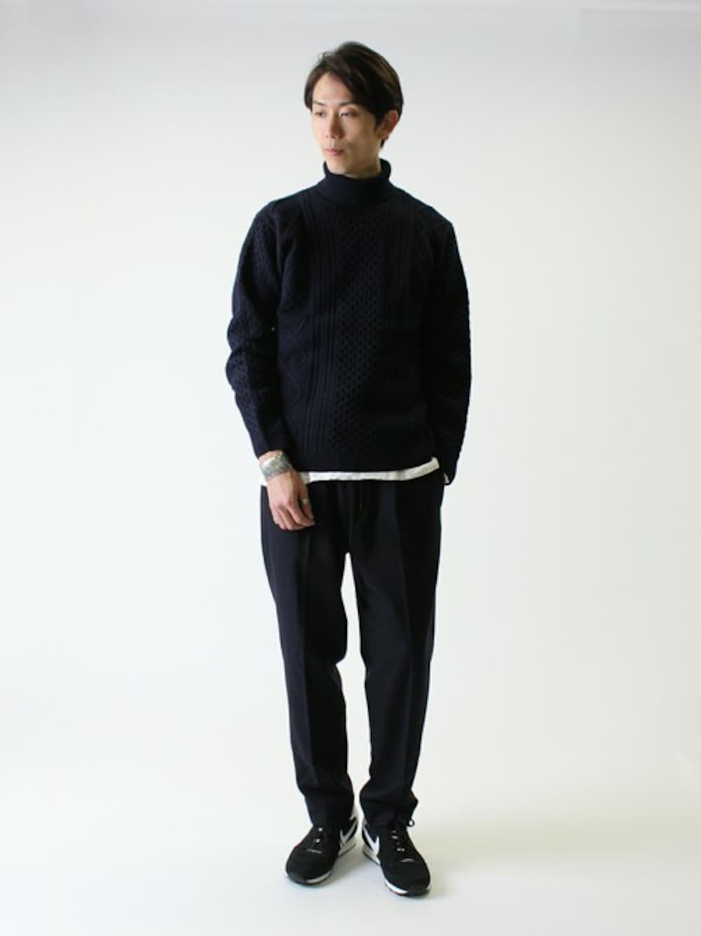 タートルネックのスタイリング 最高級ウールのメリノウールを使用した、しなやかで保温性の高いアラン柄のタートルネック。 シンプルさに編み上げの雰囲気が、より上質さを引き立ててくれます。 デザイン性のあるアイテムは一枚でも存在感がありインナー使いとしても重宝する一着です