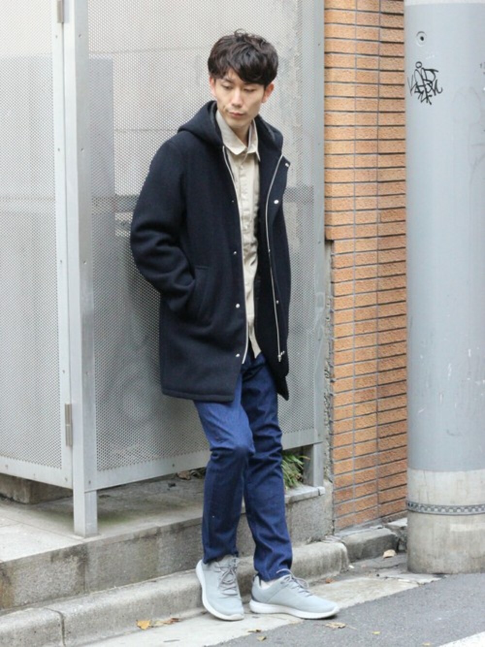 スッキリとしたシルエットが魅力的な フードコートを着てカジュアルに演出