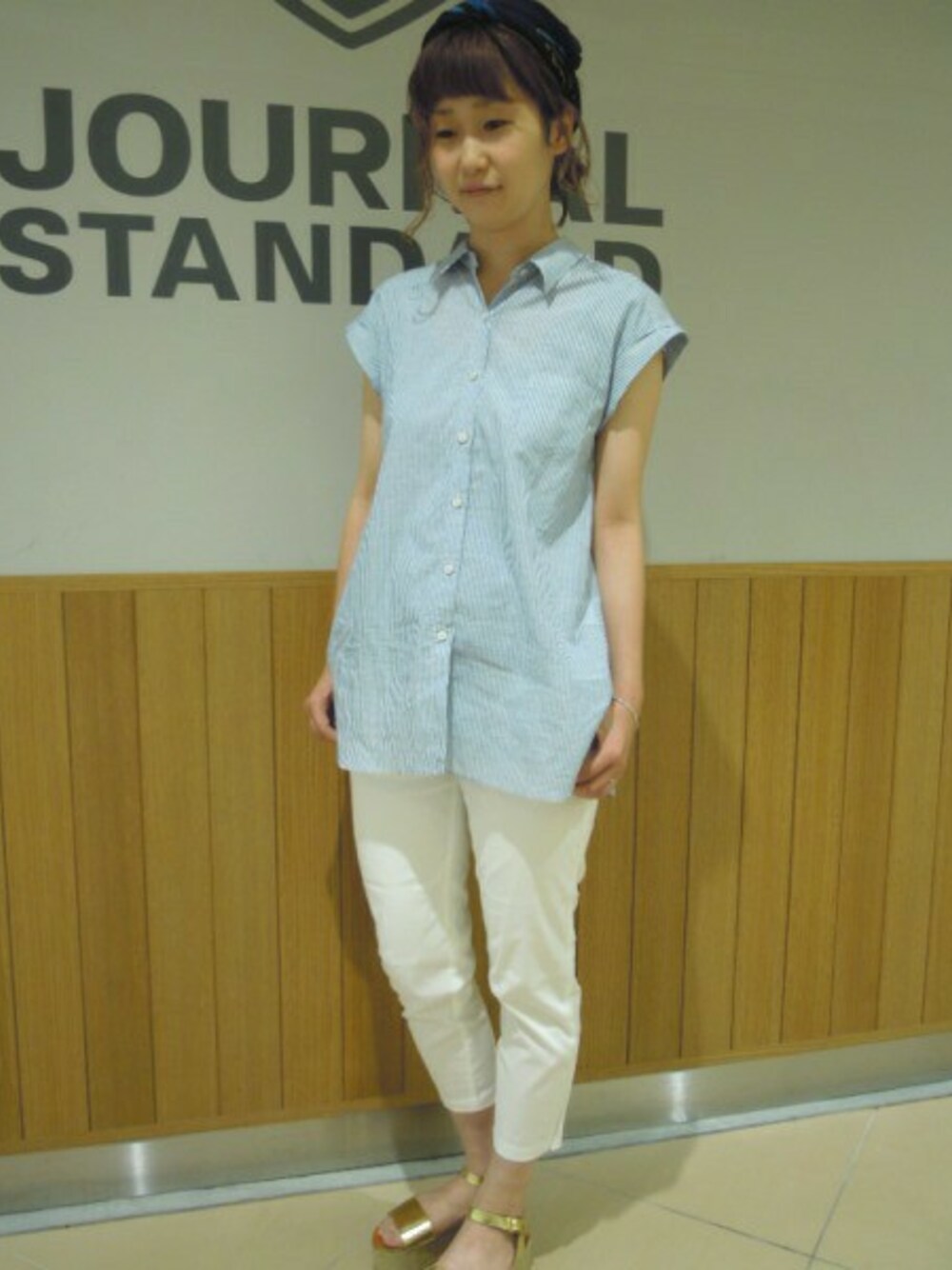SHOPでも人気のバックフレアシャツを使ったコーディネートは細身のパンツと合わせてすっきりと。 ゴールドのサンダルが夏らしさをプラスしてくれます。