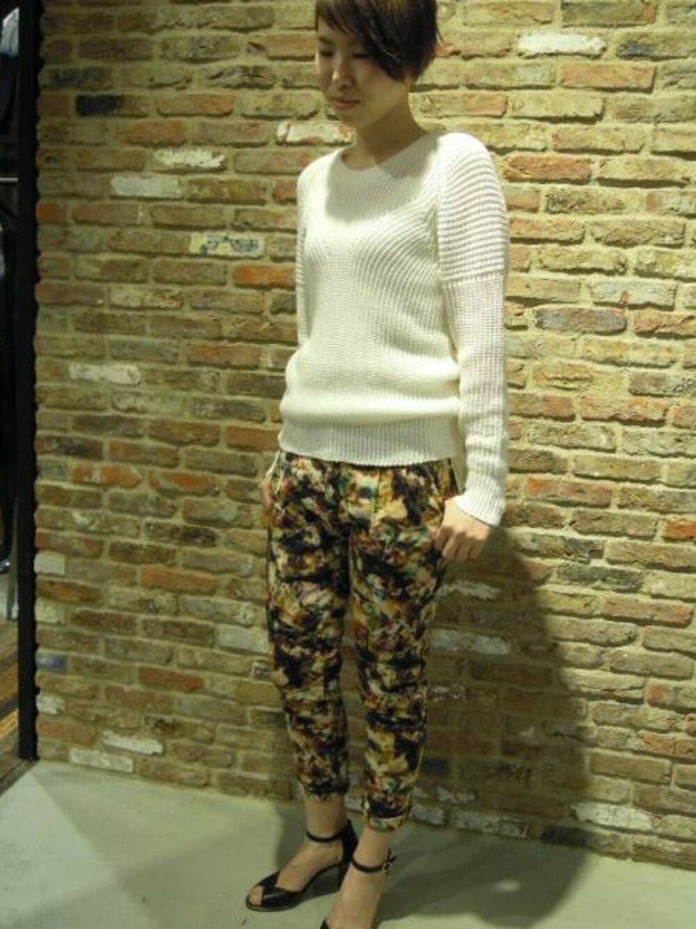 ジオメトリック(幾何学)柄がモードなパンツは、たくさんの色が使われた主役級アイテム。 細身のシルエットですがストレッチ入りなので動きやすく、フラットシューズとの相性も◎ トップスのカラーはシンプルにすると、すっきりとまとまります。