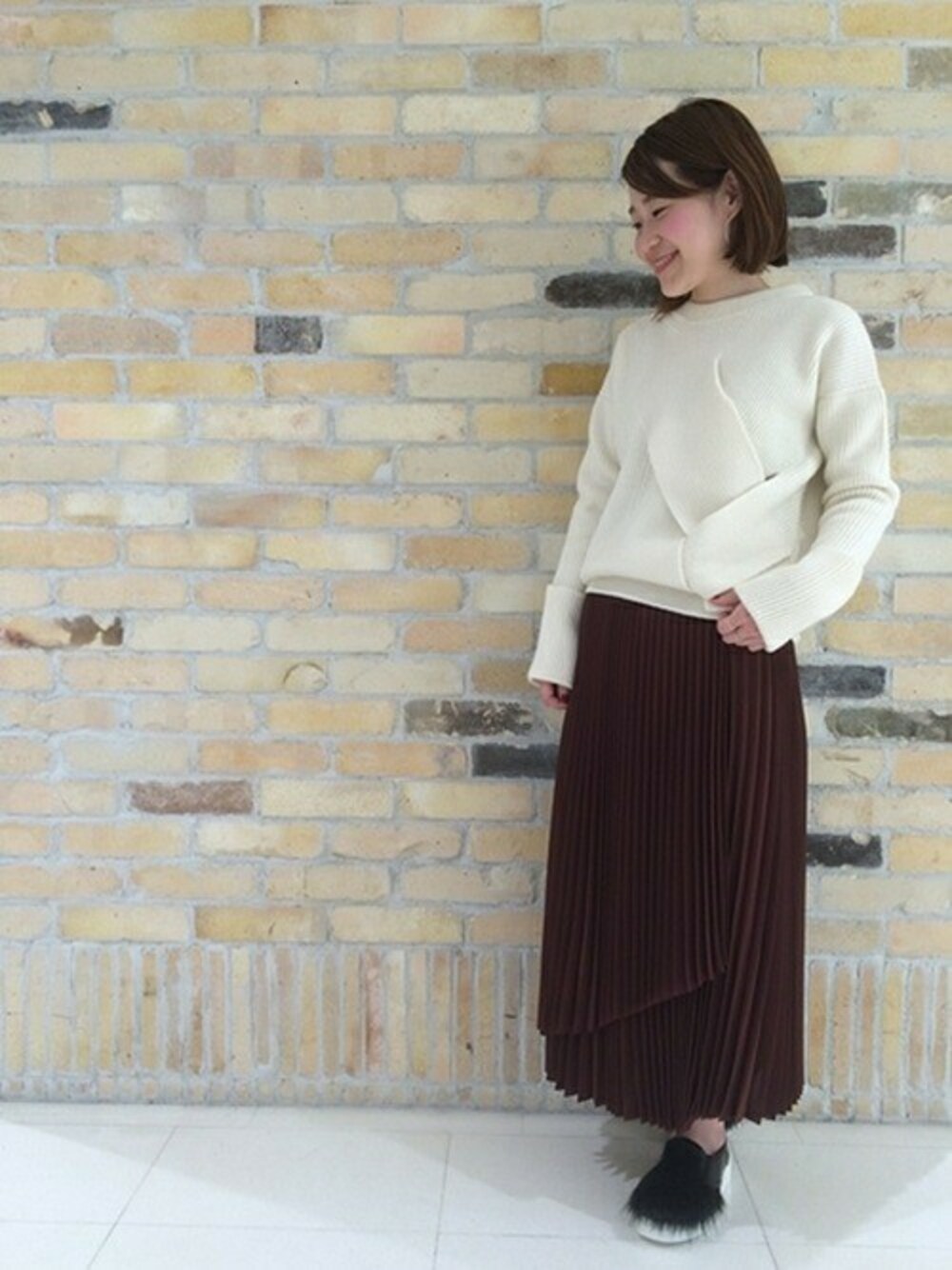 デザインニットをプリーツスカートに合わせて女性らしい印象にしたスタイリング!