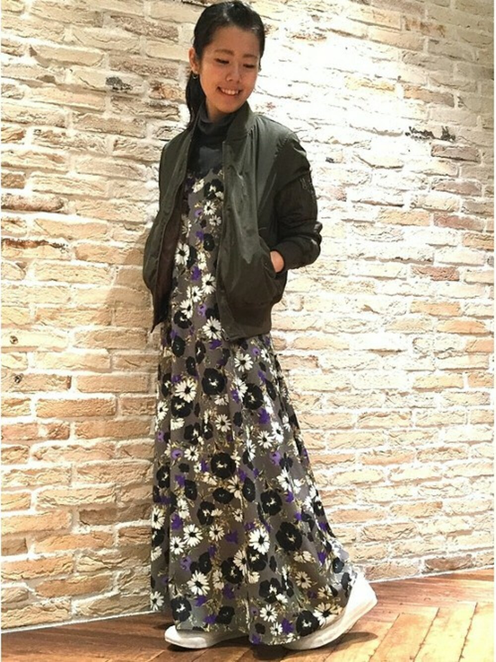 フレアに広がるフラワープリントワンピースはブルゾンやスニーカーで抜け感を出すのがおすすめです。