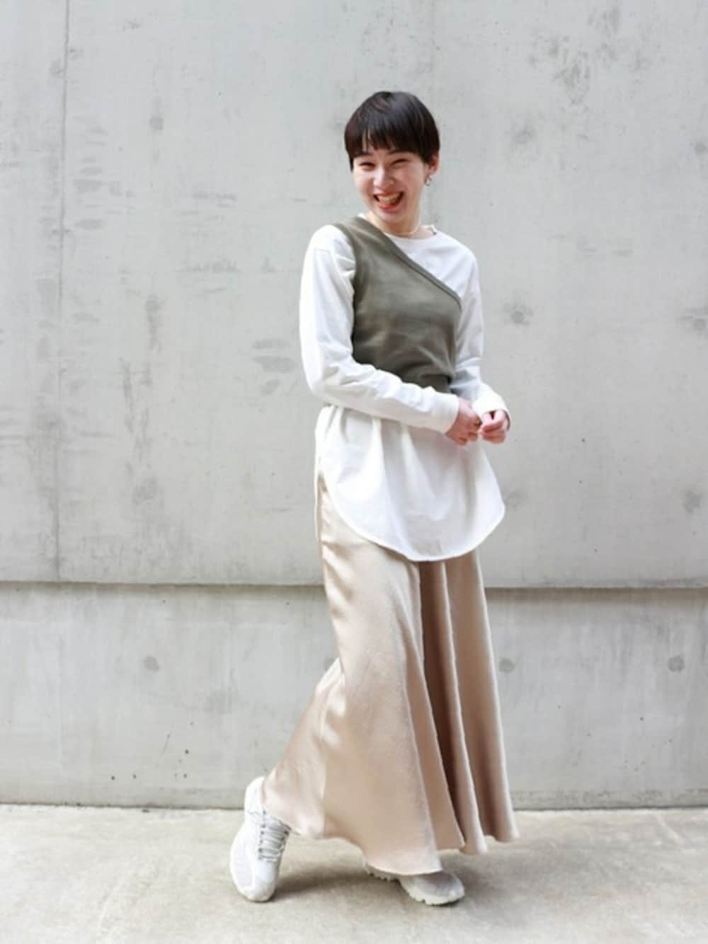今時期から夏先まで万能に着まわしできるカットソー。 ニットベストと合わせて今年っぽく着こなして。 深めに入ったスリットがボリュームスカートともバランスよく決まります。