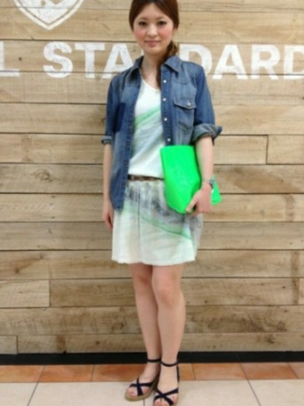 カットワンピースの上にデニムシャツを羽織った今のシーズンにぴったりなスタイル! マルチに活躍してくれるデニムシャツはスカートやワンピースと合わせてフェミニンテイストに プラスするのがおススメです!