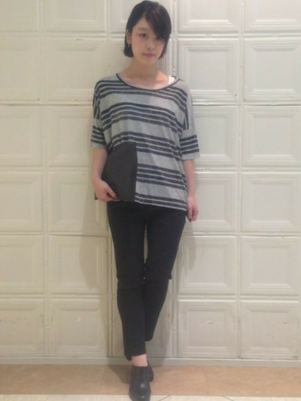 まだまだ暑いので、薄手のカットソーを合わせ、足元はブーティーで秋を意識してみました。 光沢のあるパンツとの組み合わせで、カジュアルなトップスが大人っぽく、キレイ目な印象に。