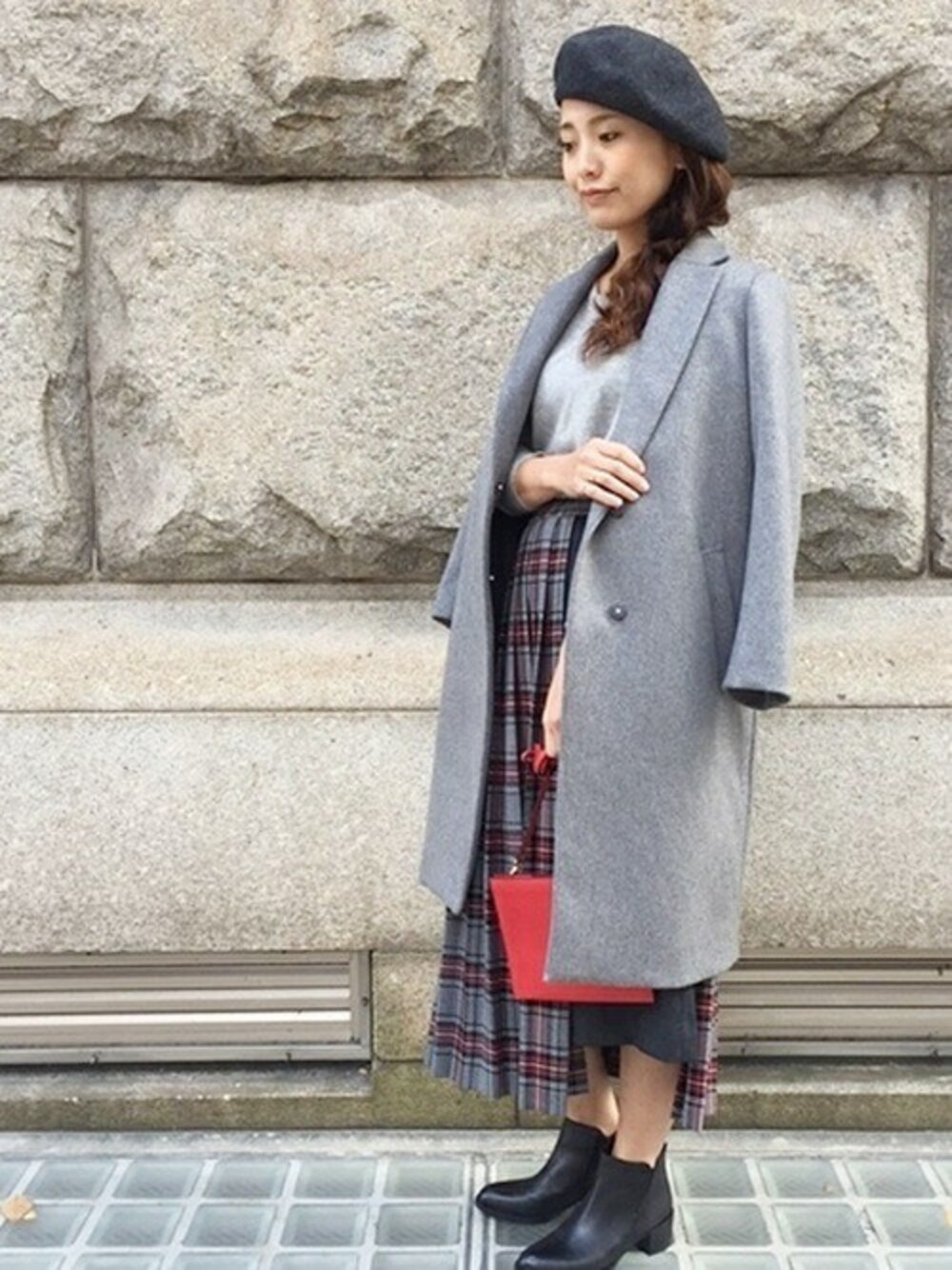 すっきりとした雰囲気のチェスターコートをチェックスカートで少しかわいくスタイリングしました。
