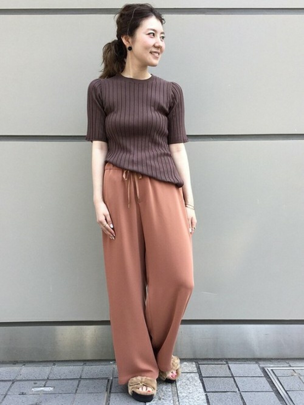 トレンドのリブカットソーをベースにワントーンで合わせて上品なコーディネートにしました。
